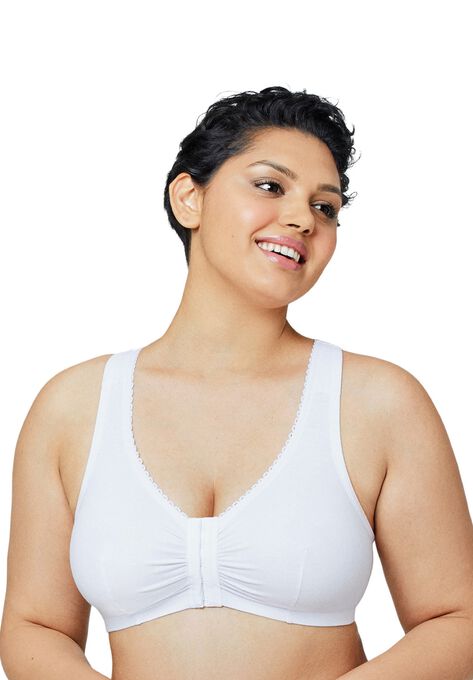 Meet your new favorite everyday bra-this cotton front close bra combines the comfort of cotton with a specially designed lace back that breathes and provides a smooth looking back. The extra wide straps provide lasting comfort and the stretch cups offer a custom fit. This bra is designed to comfort and pamper you day or night. Cotton.